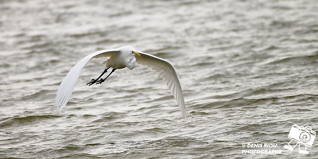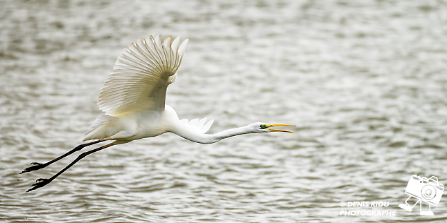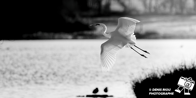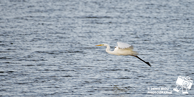 Bretagne, Brocéliande, Domaine de Careil, espace naturel. Une Grande Aigrette (Casmerodius albus) de profil en vol. Iso 250, f/8.0, 1/800 s, 700 mm.