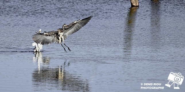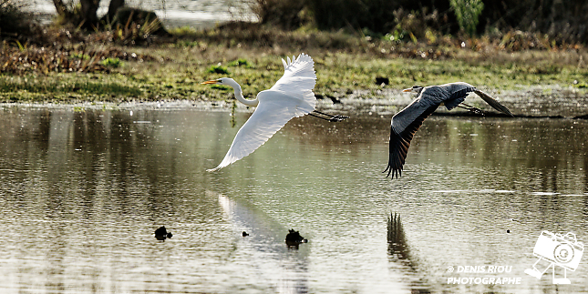 Bretagne, Domaine de Careil, espace naturel. Un Héron cendré (Ardea cinerea) se pose devant une Grande Aigrette. Iso 280, f/6.7, 1/2000 s, 300 mm + x1.4
