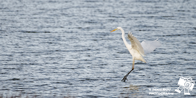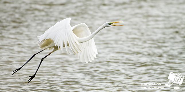 Bretagne, Brocéliande, Domaine de Careil, espace naturel. La photographie capture de début du vol d’une Grande Aigrette (Ardea alba) au dessus du plan d’eau par une journée nuageuse.