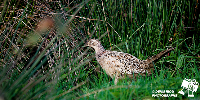 Bretagne, pays de Brocéliande. Faisan de Colchide, faisan commun (Phasianus colchicus), femelle d’élevage, elle ne posséde pas beaucoup d’attibuts pour échapper aux chasseurs. À peine craintive, peu prudente, bien qu’elle puisse voler, elle passe son temps au sol.