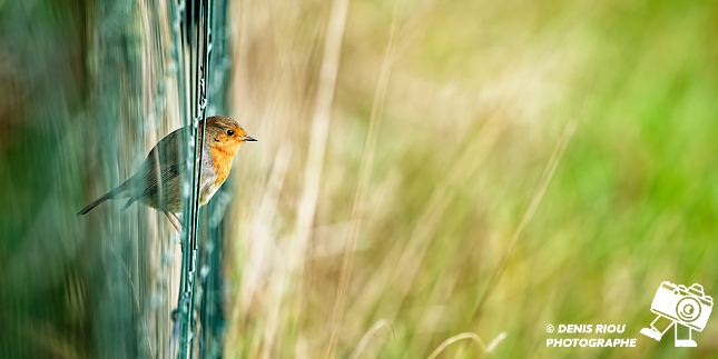 Bretagne, Brocéliande, Domaine de Careil, espace naturel. Un Rougegorge familier – Erithacus rubecula se positionne entre le grillage pour chasser les petits insectes qui s’aventurent dans la prairie.