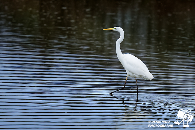 Bretagne, Brocéliande, Domaine de Careil, espace naturel. Une Grande Aigrette (Casmerodius albus) se pose sur le plan d’eau. Iso 280, f/8.0, 1/800 s, 700 mm.
