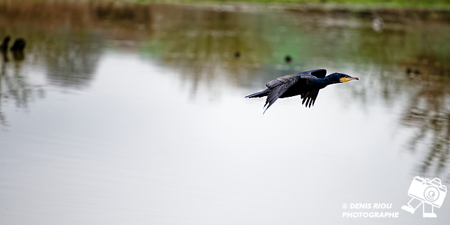 Bretagne, Brocéliande, Domaine de Careil, espace naturel. Un Grand Cormoran – Phalacrocorax carbo, en vol à +/- 30 mètres de distance, temps couvert, peu lumineux, je le vois qui passe au dernier moment, la légèreté et la maniabilité de l’objectif 300 mm f/4 avec le x1.4 (420mm) m’ont permis de capturer cette photographie.
