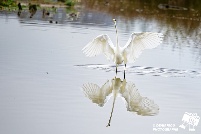 Bretagne, Brocéliande, Domaine de Careil, espace naturel. Une Grande Aigrette – Ardea alba se dégourdit les ailes en les déployant.