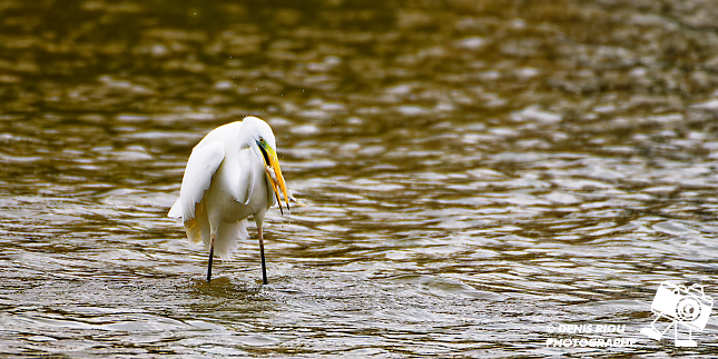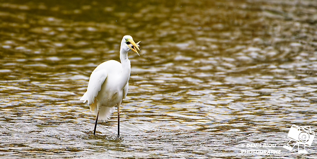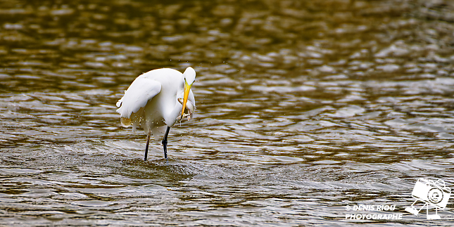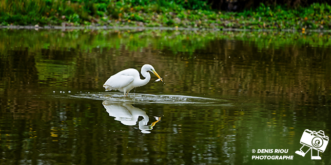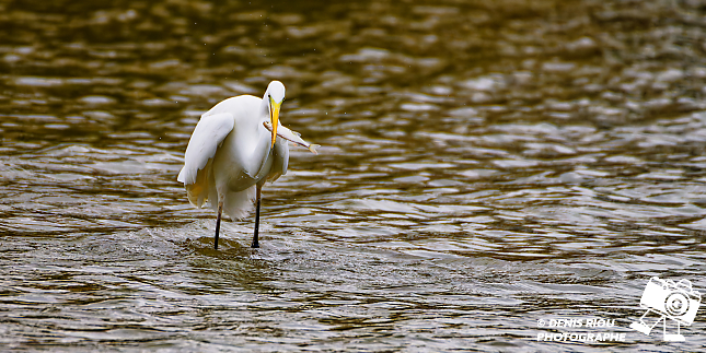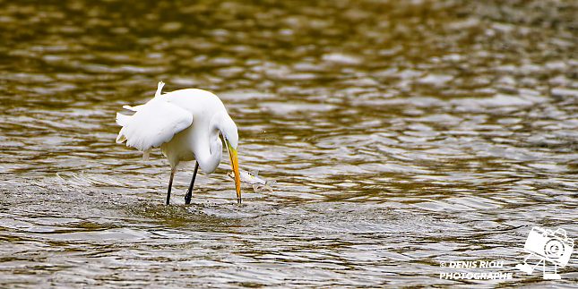 Bretagne, Brocéliande, Domaine de Careil, espace naturel. Une Grande Aigrette (Casmerodius albus). Stratégie de pêche à la marche lente dans l’eau, elle repère un poisson, un gardon (rutilus rutilus), le transperce avec son bec, l’attrape par la tête. Iso 4500, f/8.0, 1/4000 s, +2/3 EV, 700 mm.