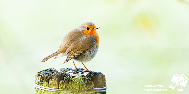 Bretagne, Brocéliande, Domaine de Careil, espace naturel. Un Rougegorge familier (Erithacus rubecula), bien installé sur un piquet, il cherche les rares insectes encore disponibles pour se nourrir.