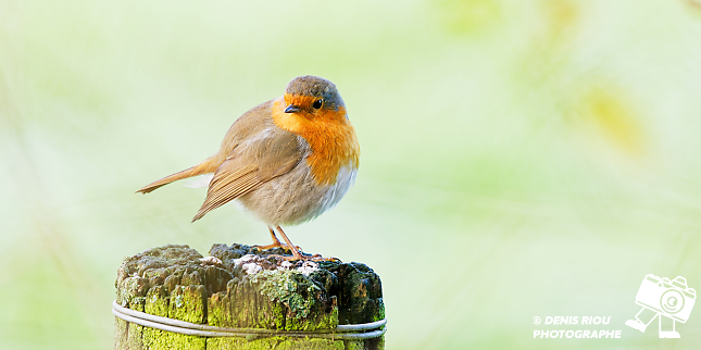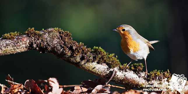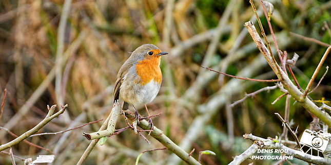 Bretagne, Domaine de Careil, espace naturel. Petit, rond, avec un plastron rouge orangé, un poil solitaire, guerrier à ses heures, il défend son territoire, c’est le Rougegorge familier – Erithacus rubecula. Iso 1400, f/8, 1/500 s, 300 mm + x1.4.