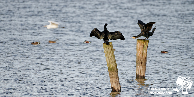 Bretagne, Brocéliande, Domaine de Careil, un Grand Cormoran (Phalacrocorax carbo) étale ses ailes, l’autre n’est pas content, une Grande Aigrette passe tranquillement.