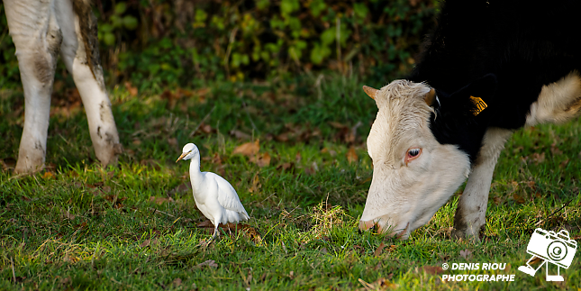 Bretagne, Brocéliande, un Héron garde-bœufs (Bubuleus ibis) cherche des insectes autour des vaches. Iso 100, f/10, 1/500 s, 700 mm.