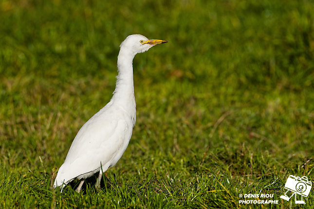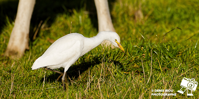 Bretagne, Brocéliande, un Héron garde-bœufs (Bubuleus ibis) dans un pré. Iso 100, f/11, 1/500 s, 700 mm.