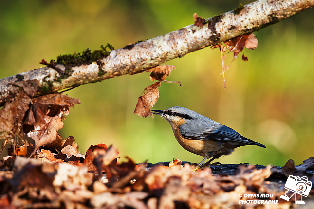 Sittelle torchepot (Sitta europaea), une feuille gène la recherche, il la prend dans son bec et d’un mouvement de tête l’écarte. Hiver 2025, Cernoy-en-Berry.