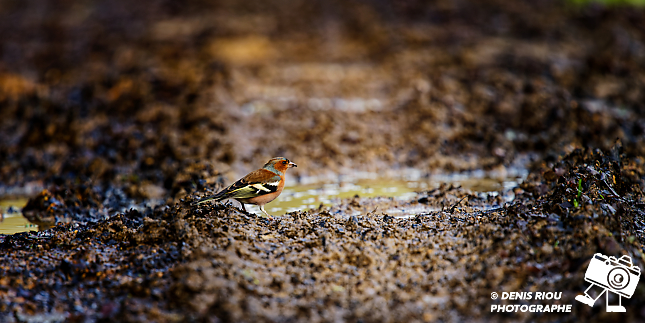 Il pleut depuis plusieurs jours, le Pinson des Arbres ( Fringilla coelebs ) cherche de la nourriture dans la boue.