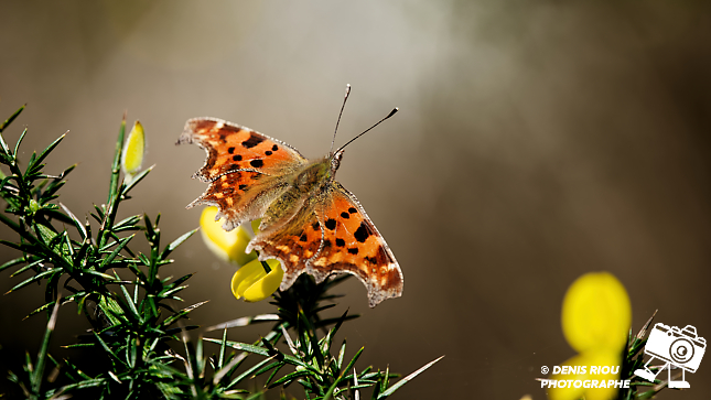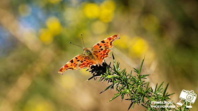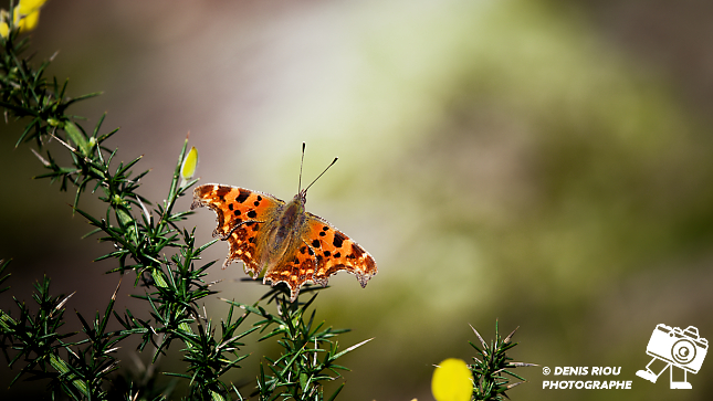 Papillon Robert-le-diable ( Polygonia-c-album ) dans les landes sèches d’Iffendic, Bretagne. Au 300 mm à f/4 au 1/400 s, 100 iso à une distance de 1m70.
