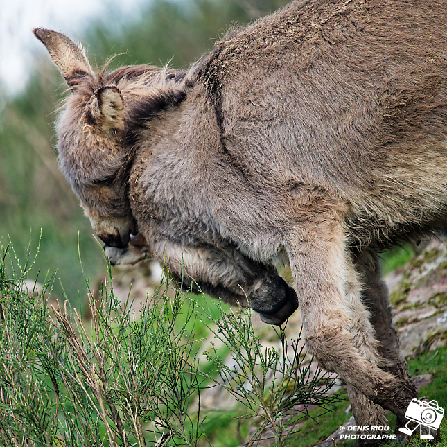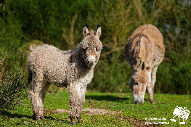 Ânes (Asinus) dans un champ. L’ânon, une petite boule de poils gris , un regard triste mais un sacré joueur.
