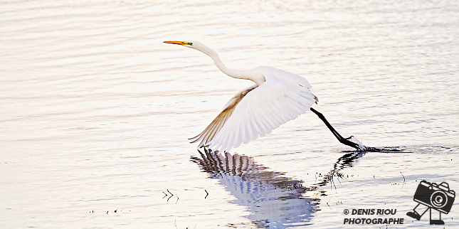Une Grande Aigrette (Ardea alba ; ex Egretta alba), les ailes se déploient après la première poussée.