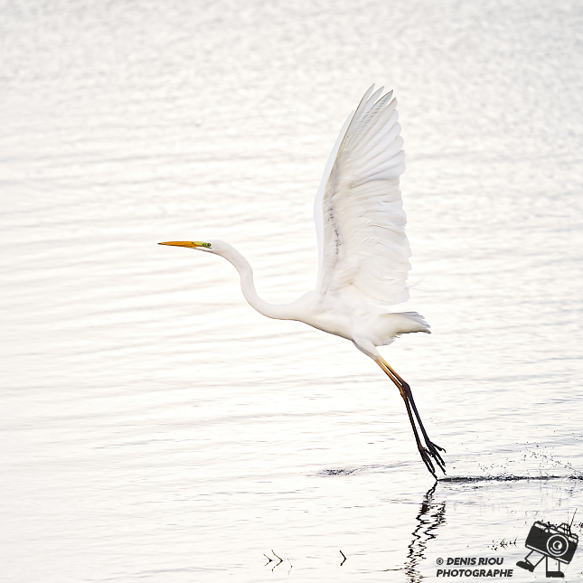 L’envol d’une Grande Aigrette ( Ardea alba ) par un temps gris à la réserve ornithologique de Careil. Première poussée pour décoller.