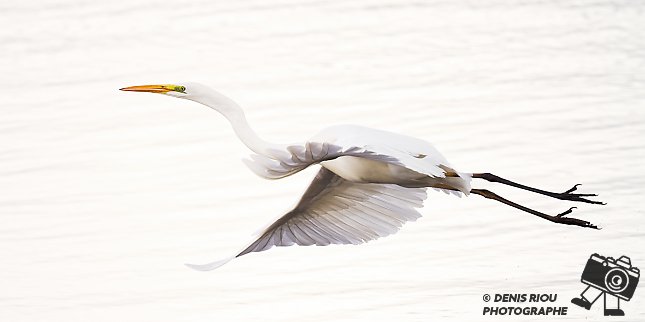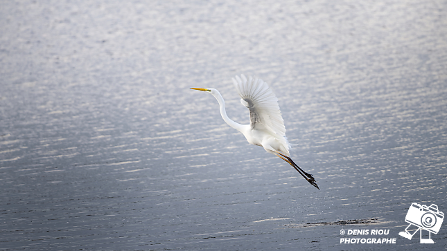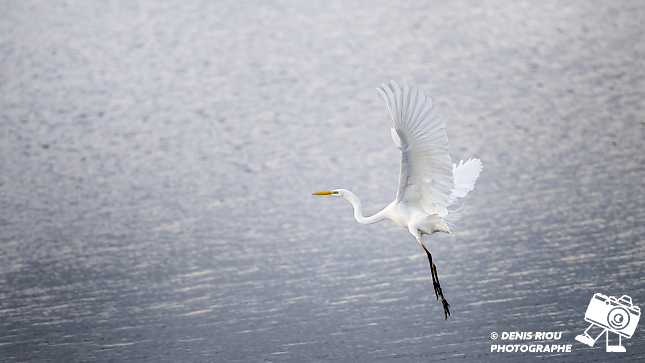 L’envol d’une Grande Aigrette ( Ardea alba ) par un temps gris à la réserve ornithologique de Careil. Deuxième acte, battement des ailes.