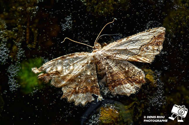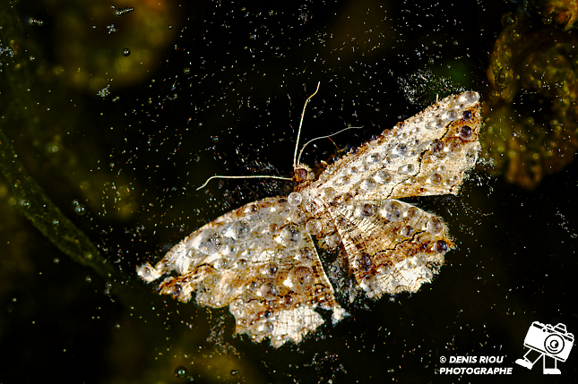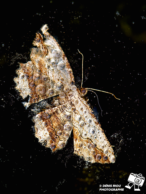 Un papillon tombé dans une flaque d’eau, il est recouvert de perles d’eau qui emprisonnent une multitude d’écailles qui se détachent des ailles.