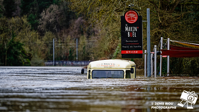 20 février 2026, le restaurant le Marin’Boël à Guichen. Le parking et le halage ont disparus sous les eaux boueuses de la Vilaine.