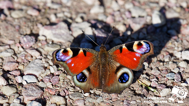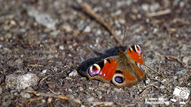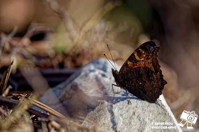 Le Paon-du-jour ( Aglais io ) de profil, posé sur une pierre pour récupérer de la chaleur. Vallée du Canut, Lassy, Bretagne.