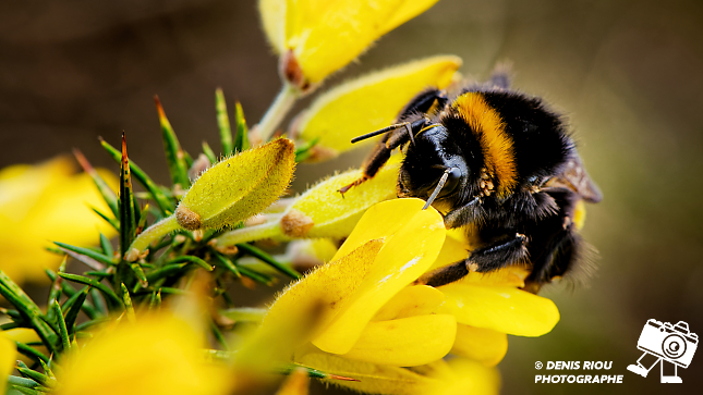 Un bourdon terrestre ( Bombus terrestris ) infesté par des parasites ( acariens ), se repose sur les fleurs d’un ajonc.