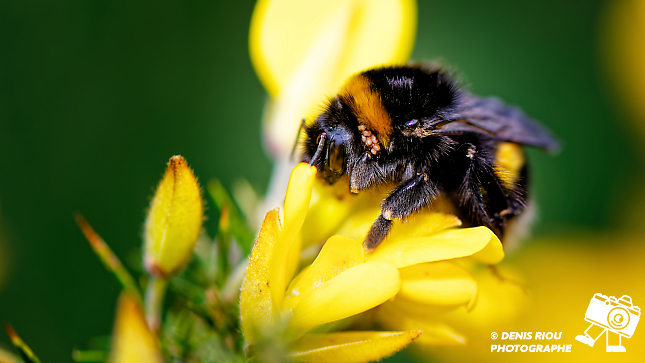 Un bourdon terrestre ( Bombus terrestris ) se repose sur les fleurs d’un ajonc. Il est infesté par des parasites ( acariens ).