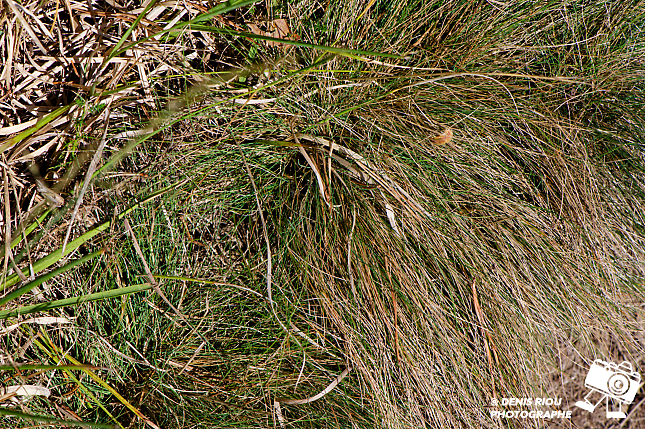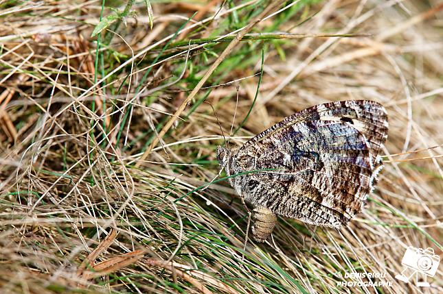 L’acte de dépose de l’œuf de l’Agreste – Hipparchia semele vient de se terminer, elle va partir à quelques mètres et recommencer l’opération plusieurs dizaines de fois.