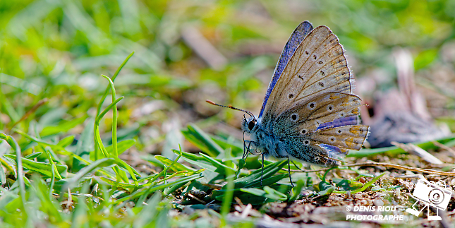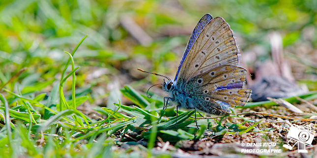 L’ Azuré de la Bugrane – Polyommatus icarus (mâle) posé au sol, l’action de la spiritrompe déroulée (canal alimentaire) est séduisante, intrigante. Photo en contre-jour : iso 400, f/10.0, 1/500 s, 147 mm, mode A, mesure matricielle. Saint-Gildas-de-Rhuys