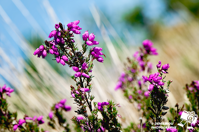 Bruyère cendrée – Erica cinerea dans les landes sèches bretonnes. Ici, je me positionne en contre-plongée pour avoir en arrière-plan les herbes sèches qui partent vers le ciel bleu breton. Iso 560, f/13,0, 1/500 s, 147 mm, mode A, mesure matricielle.