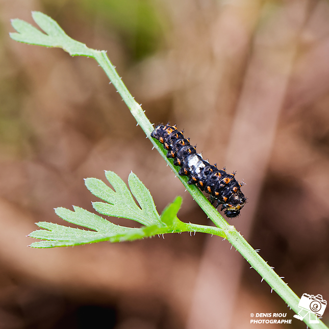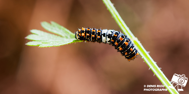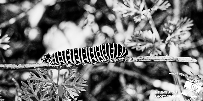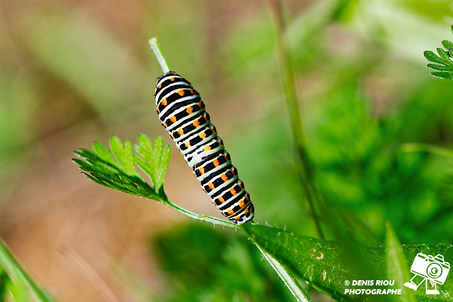 Une autre Chenille du Machaon, 17 jours après le dépôt de l’œuf. Toute noire avec des taches orange au départ, le blanc apparaît de plus en plus.