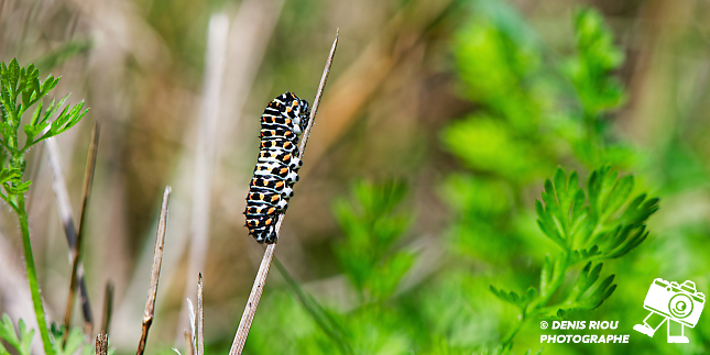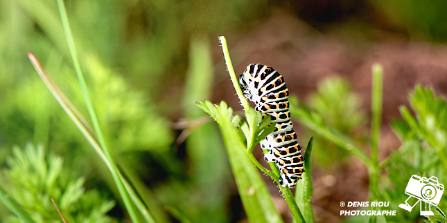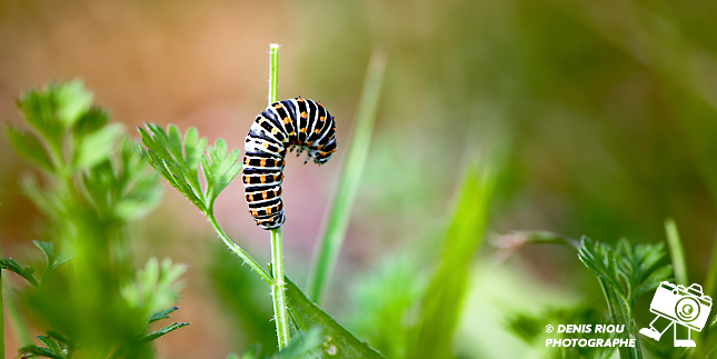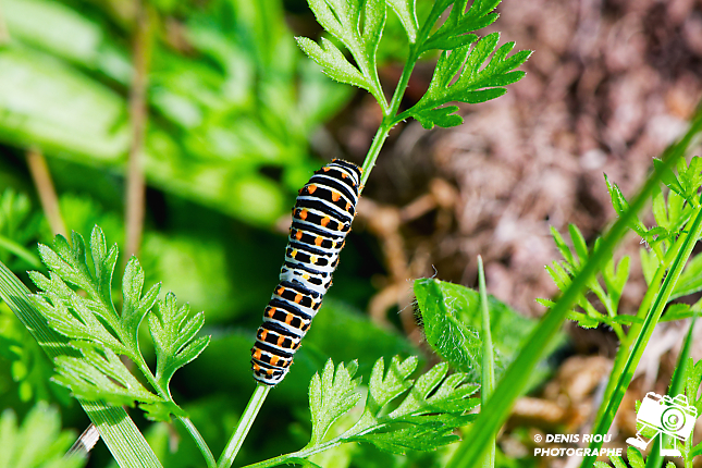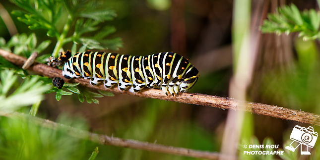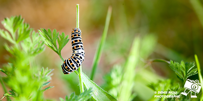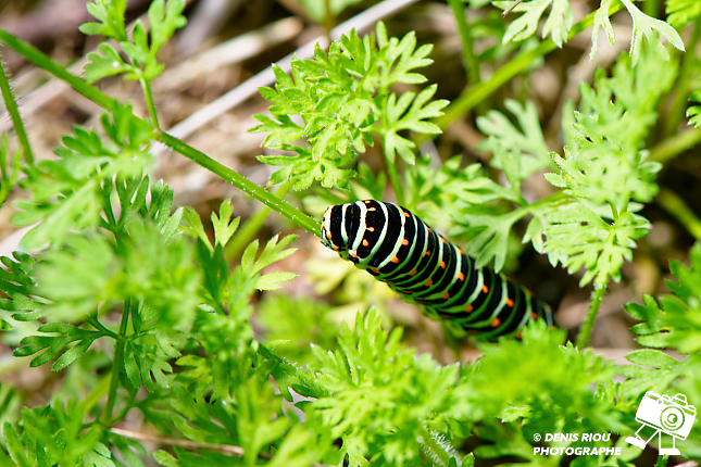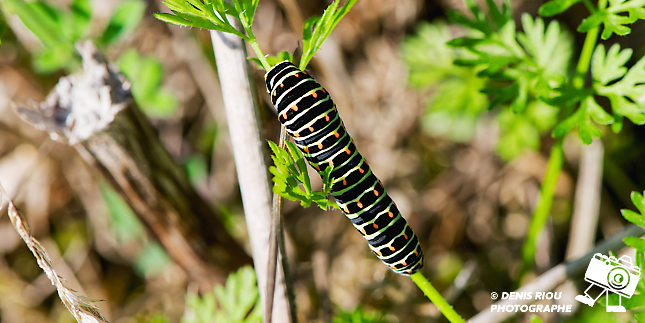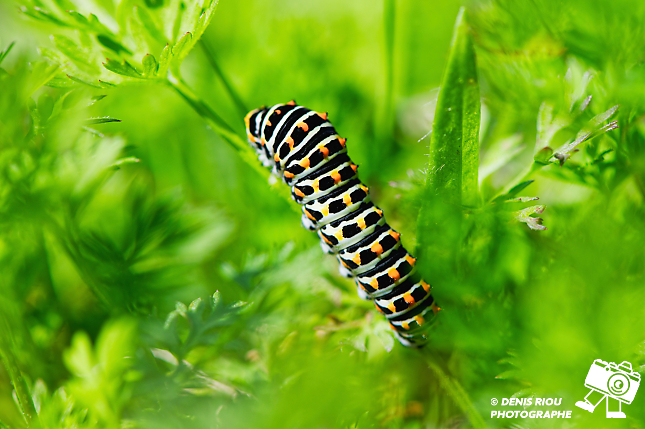 La Chenille du Machaon, 17 jours après le dépôt de l’œuf par le papillon Machaon. Le choix stratégique du papillon a été bien réalisé, la chenille a de quoi satisfaire son appêtit avec toutes ces feuilles de carottes sauvages.