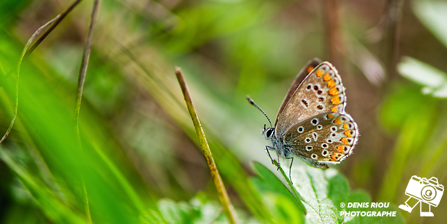 Nature bretonne : un minuscule papillon Le Collier-de-corail – Aricia agestis au bord d’un champ. Réglages photo : iso 100, f/4.8, 1/500 s, -1.3 EV, 147 mm, mode S, mesure matricielle, Flash SB 900.