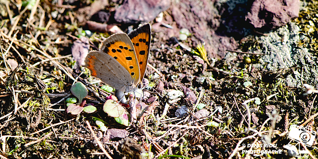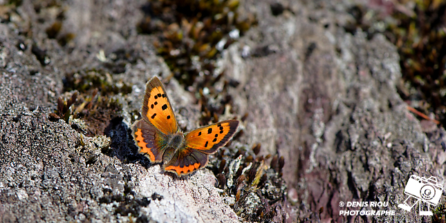 Le Cuivré commun – Lycaena phlaeas, au bord de l’escarpement rocheux de l’Étunel. Bretagne, Brocéliande.