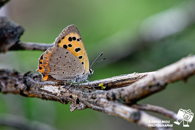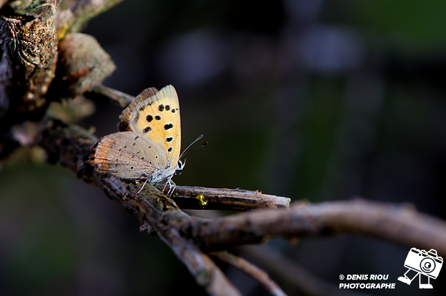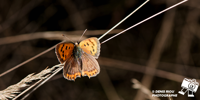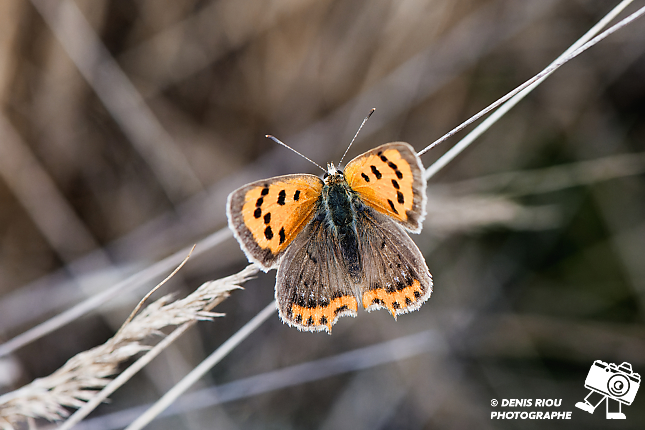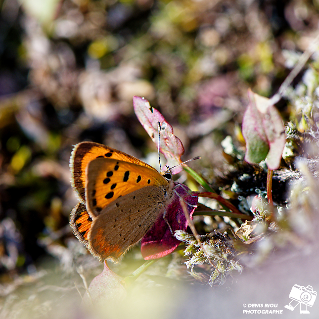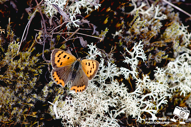 Beauté de la biodiversité des landes sèches en Brocéliande, entre mousses, lichens, papillons… ici le Cuivré commun – Lycaena phlaeas émerveille avec ses ailes couleur orange et brun, les petites taches brunes…