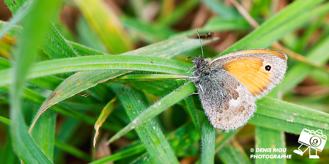 Je prends le temps de photographier le Fadet commun – Coenonympha pamphilus, dans un champ d’herbes.