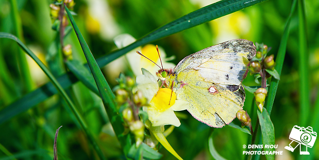 Un papillon Le Souci – Colias crocea, il commence à replier « à rouler » sa spiritrompe avant d’aller vers une autre fleur.