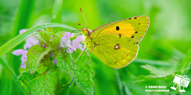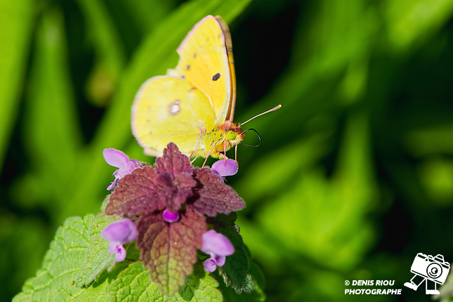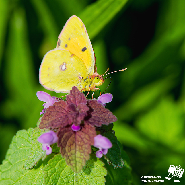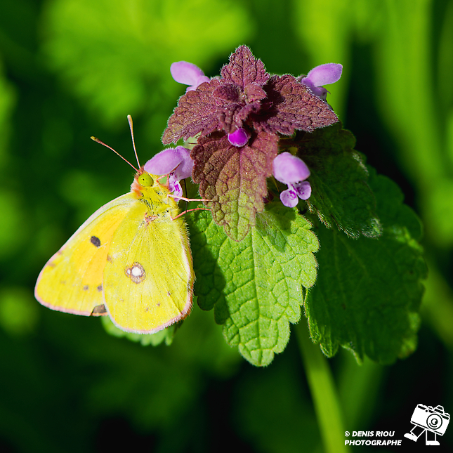 Nature bretonne : un papillon Souci – Colias crocea cherche le nectar (il est sucré et riche en nutriments) des fleurs de Lamier pourpre – Lamium purpureum. Réglages photo : iso 640, f/5.6, 1/640 s, +1.3 EV, 420 mm, mode S, mesure matricielle.