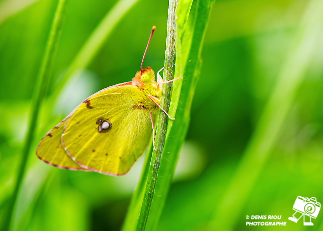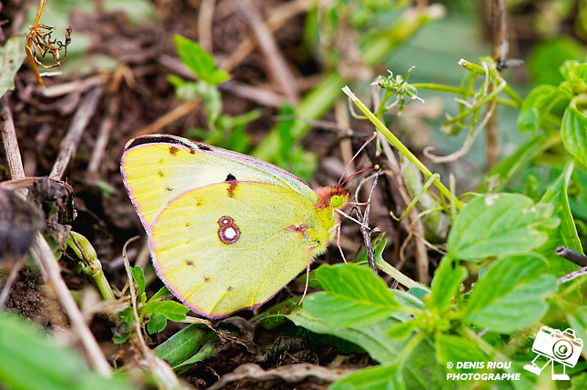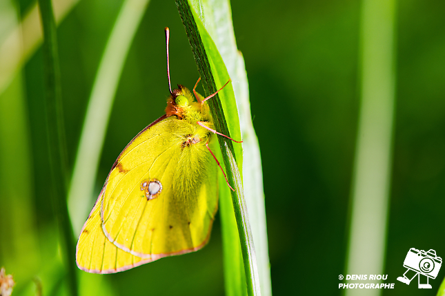 Le Souci – Colias crocea au repos. Remarquable papillon à dominante jaune, des antennes roses, les yeux verts clairs, les pattes roses, une tache blanche cerclée et entourée de brun, des petites taches brunes, une bordure des ailes rose. Le Souci se pose les ailes fermées.