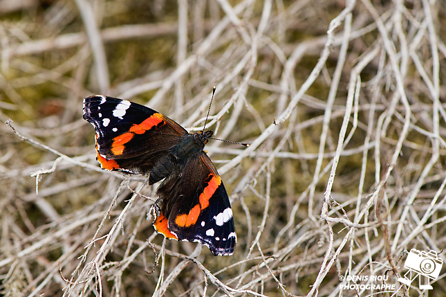 Le Vulcain – Vanessa atalanta. À cinq, six mètres dans la lande sèche, j’approche délicatement sans faire de bruit, difficile car les brindilles sèches craquent au moindre de mes pas, elles crissent : bruit aigu souvent désagréable pour les papillons qui s’envolent aussitôt. De loin je pense que les ailes sont abimées mais non, il les écarte au maximum pour profiter du peu de soleil de la journée pour réchauffer son abdomen.