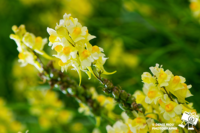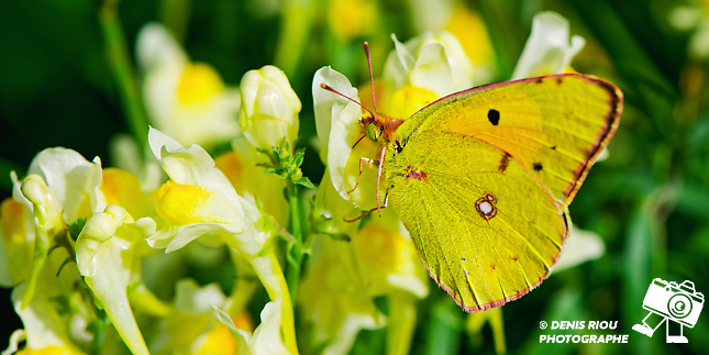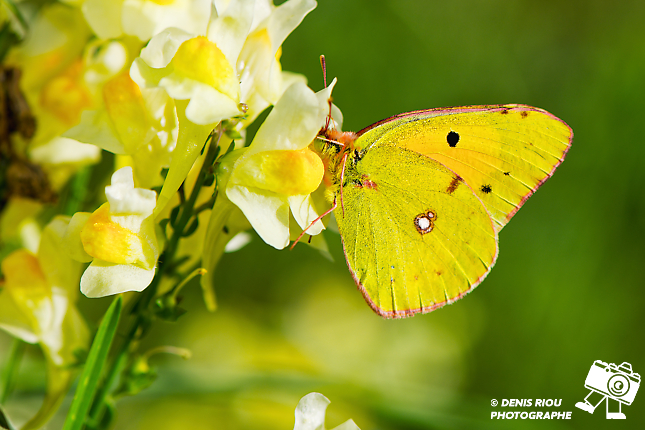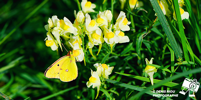 Nature bretonne : cadrage plan moyen, le sujet, un papillon Souci – Colias crocea avec sa couleur jaune safran. Il butine des fleurs de Linaire commune – Linaria vulgaris. Réglages photo : iso 100, f/9.0, 1/500 s, -1.3 EV, 147 mm, mode S, mesure matricielle.