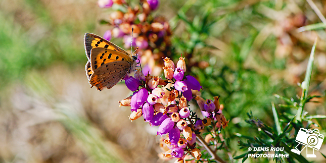 Le Cuivré commun – Lycaena phlaeas et la Bruyère cendrée – Erica cinerea. La bruyère cendrée fleurit en fin d’été, automne, elle offre ainsi un peu de nectar aux papillons pour leur survie.