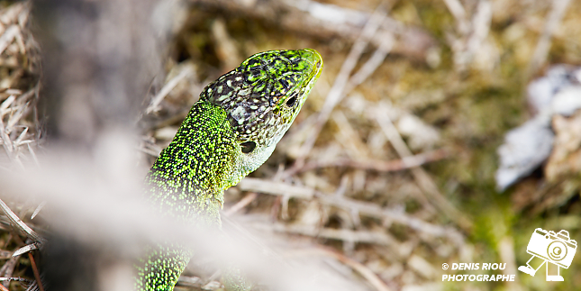 Nature bretonne : Le regard du Lézard vert – Lacerta bilineata à la recherche de la moindre proie sur son domaine de landes sèches. Falaises de l’étang de l’Étunel, coté Monterfil.