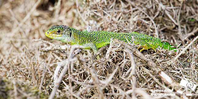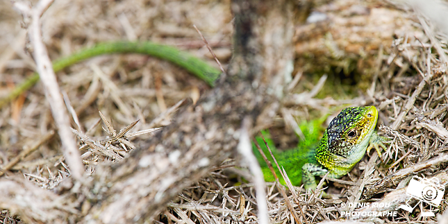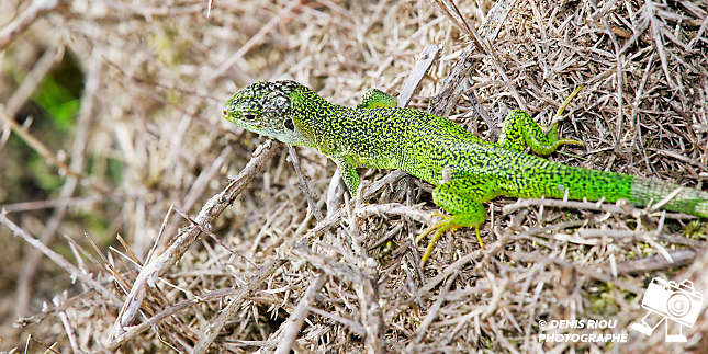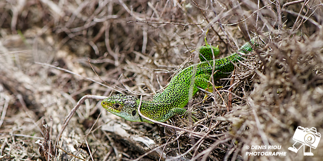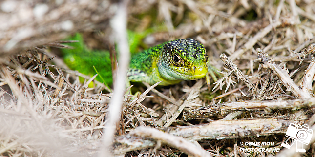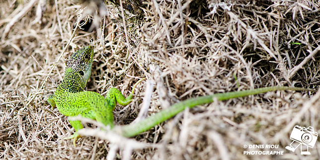 Nature bretonne : un Lézard vert – Lacerta bilineata dans les landes sèches. Il se faufille entre les ajoncs secs en observant le moindre mouvement d’une éventuelle proie. Falaises de l’étang de l’Étunel, coté Monterfil.