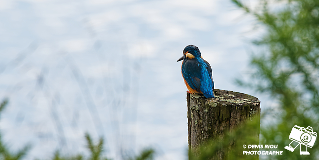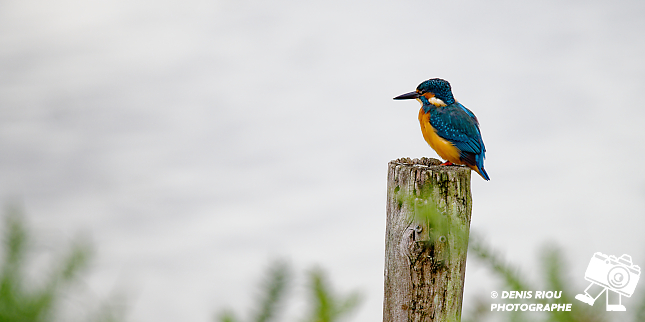 Martin-pêcheur d’Europe _ Alcedo atthis au Domaine de Careil, posé sur un piquet, il surveille. Le bleu, le bleu azur, l’orange dominent pour les couleurs de cet oiseau, une petite merveille de la nature