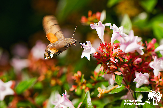 En matinée, je suis avec ma tasse de café, lorsque j’aperçois un Moro-sphinx – Macroglossum stellatarum butinant des fleurs d’Abélia grandiflora. Je courre prendre mon appareil, le flash (je suis bien à l’ombre) et réalise cette photographie : mes réglages : Iso 200, f/7.1, 1/500 s, +1/3 EV, 147 mm, mamuel, mesure martricielle, flash Sb-900 déporté en auto, le tenant de la main gauche, déchenché via SU-800.