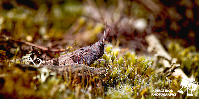 Oedipode turquoise – Oedipoda caerulescens, un criquet caché dans la mousse des landes sèches bretonnes.