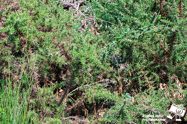 Mon regard a détecté un mouvement, quelque chose vient de se poser parmi les ajoncs. Pas facile de le repérer mais environ au milieu du cliché, je vois des ailes et un « trait bleu, vert. Il n’y a plus qu’à faire une approche. Contre toute attente, le voici qui s’envole, je le vois qui se pose à plusieurs mètres. Vous avez trouvé Aeshna cyanea ?