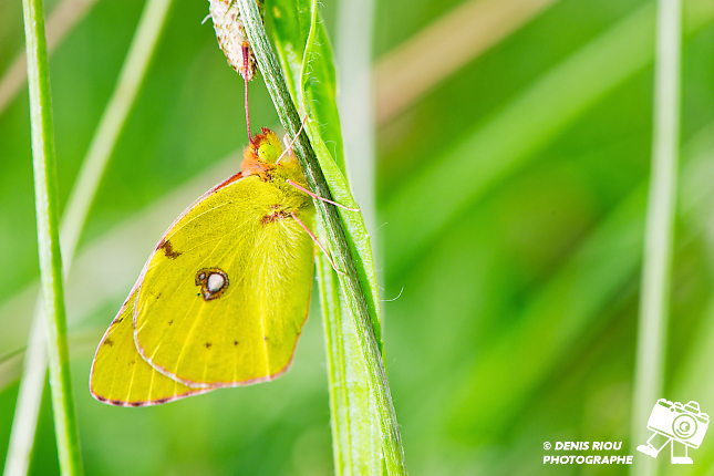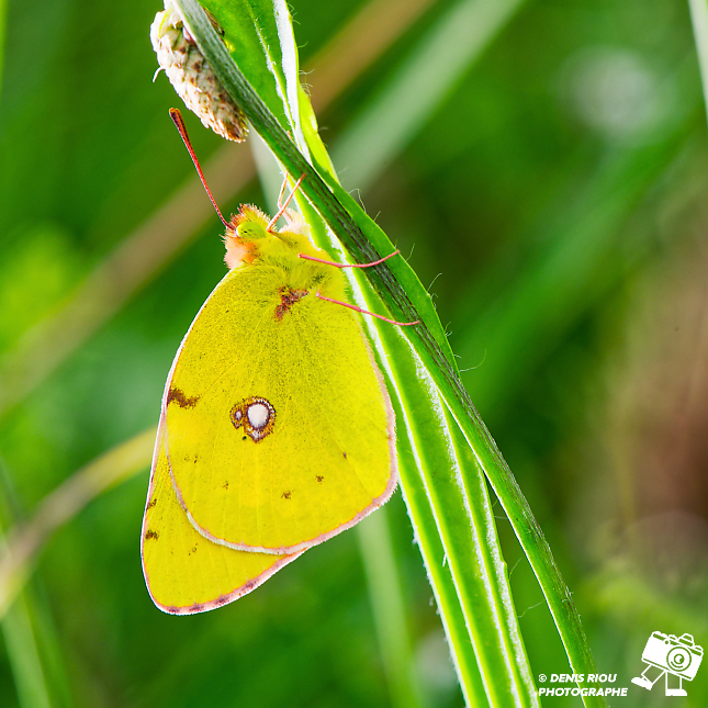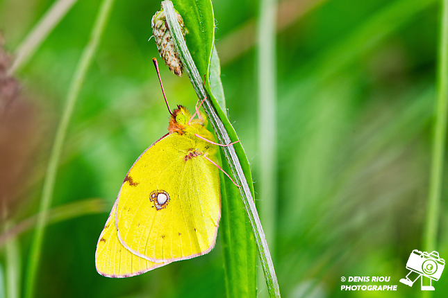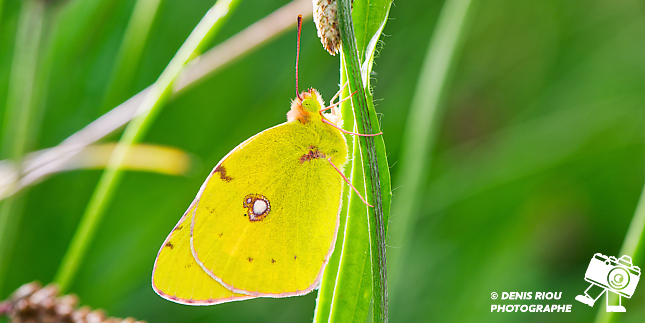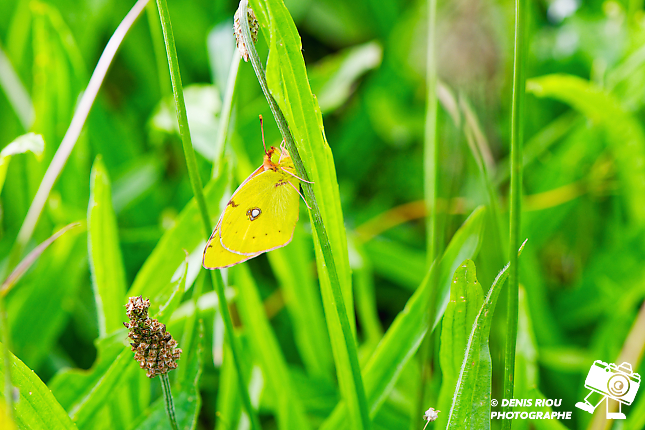Le Souci – Colias crocea au repos, accroché sur la tige d’un plantain. Il se trouve dans différents milieux ouverts comme des champs d’herbes, de trèfles, des friches, des prairies fleuries. Sa couleur jaune-safran permet de le repérer assez facilement dans la verdure.