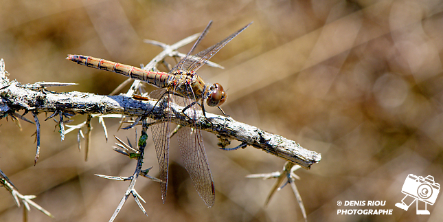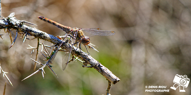 Sympétrum strié – Sympetrum striolatum dans les landes sèches au-dessus de l’étang de l’Étunel. Mes réglages pour cette photographie : iso 900, f/13.0, 1/500 s, 147 mm, manuel, mesure pondérée hautes lumières.