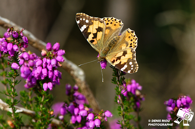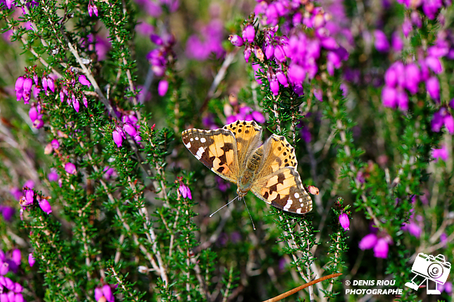 La Belle-Dame – Vanessa cardui passe de bruyère en bruyère sur la lande sèche. Très agréable d’apercevoir toutes ces « clochettes violettes » qui égaient le paysage.